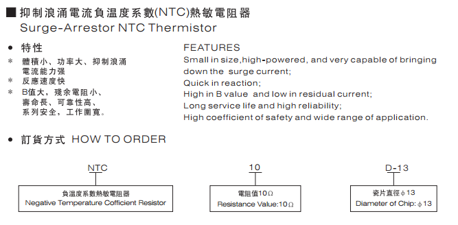 NTC熱敏電阻器:是以錳、鈷、鎳和銅等金屬氧化物為主要材料,采用陶瓷工藝制造而成的。NTC熱敏電阻器在室溫下的變化范圍在10°歐姆~10⒍歐姆,溫度系數(shù)-2%~-6.5%。它具有電阻值隨溫度的上升而下降的特性。適用于轉(zhuǎn)換電源、開關(guān)電源、UPS電源、各類電加熱器、電子節(jié)能燈、電子鎮(zhèn)流器、各種電子裝置電源電路的保護(hù)以及彩色顯示管、白熾燈及其他照明燈具的燈絲保護(hù)。