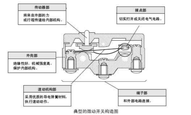 微動(dòng)開(kāi)關(guān)具有微小接點(diǎn)間隔和速動(dòng)機(jī)構(gòu),用規(guī)定的行程和力進(jìn)行開(kāi)關(guān)動(dòng)作的接點(diǎn)機(jī)構(gòu),被外殼覆蓋, 其外部有傳動(dòng)器,且外形較小。下圖為典型的微動(dòng)開(kāi)關(guān)構(gòu)造的一個(gè)示例。
