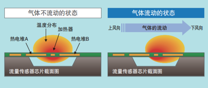 歐姆龍MEMS流量傳感器檢測(cè)原理:在沒(méi)有氣體流動(dòng)的情況下以加熱器為中心,溫度分布左右對(duì)稱。流動(dòng)的狀態(tài)下,加熱器上風(fēng)向的溫度低,下風(fēng)向溫度高,溫度分布不再對(duì)稱。將該溫差作為熱電堆的電動(dòng)勢(shì)之差進(jìn)行傳感,可測(cè)量流量、流速而不影響溫度、壓力。此外,熱電堆為熱電動(dòng)勢(shì)方式,與電阻式相比,有助于降低功耗。