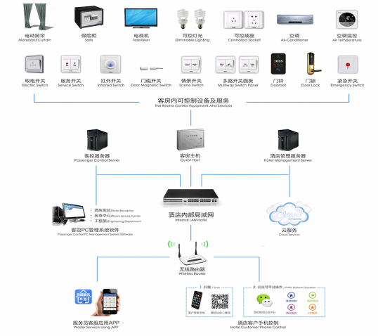 客房智能控制主機(jī)、客房控制面板和客房管理軟件三部分組成客房智能控制系統(tǒng),并可以根據(jù)客戶需求自由組合和擴(kuò)展模塊。通過(guò)弱電控制強(qiáng)電的方式,實(shí)現(xiàn)對(duì)照明、排氣扇、空調(diào)、窗簾、音視頻及服務(wù)信息等功能控制。采用TCP/IP協(xié)議或CAN-BUS總線組網(wǎng),能夠?qū)崿F(xiàn)遠(yuǎn)程管理與控制,還可以與蘋果(IOS)、安卓(Android)系統(tǒng)的移動(dòng)終端設(shè)備無(wú)縫連接,可由移動(dòng)終端設(shè)備進(jìn)行控制,為客房營(yíng)造典雅、溫馨、舒適的環(huán)境,實(shí)現(xiàn)酒店的智能控制、綠色環(huán)保和高效管理。