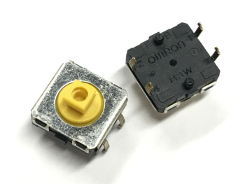 2、輕觸式開關(guān)——代表型號:歐姆龍B3W型輕觸開關(guān),超小超薄,備有6mm方形、12mm方形2種,便于靜電對策的帶接地端子型也有。凸型頂塊上可以安裝鍵頂。