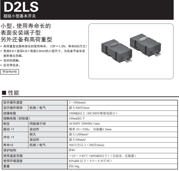 歐姆龍D2LS系列開關(guān),高荷重型也擁有達(dá)到500萬次的電氣壽命,超級(jí)小型身材,寬度8.6*進(jìn)深4.8*3.0mm尺寸,為設(shè)備節(jié)省安裝面積,觸感良好,容許操作速度1~500mm/s,操作頻率最大300次/min,重量僅有0.16g。