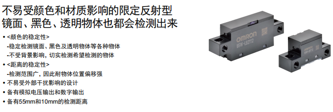 對于玻璃機械來說,歐姆龍檢測有無的光電傳感器B5W-LB2112-1擁有著絕對優(yōu)勢。歐姆龍傳感器抗陽光干擾強,可穩(wěn)定檢測鏡面、黑色、透明物體,接受來自檢測物體的反射光以檢測物體有無,擁有限定了投光光束和受光區(qū)域的光學(xué)系統(tǒng),僅可檢測相距傳感器一定距離(投光光束與受光區(qū)域重合的范圍)的檢測物體。