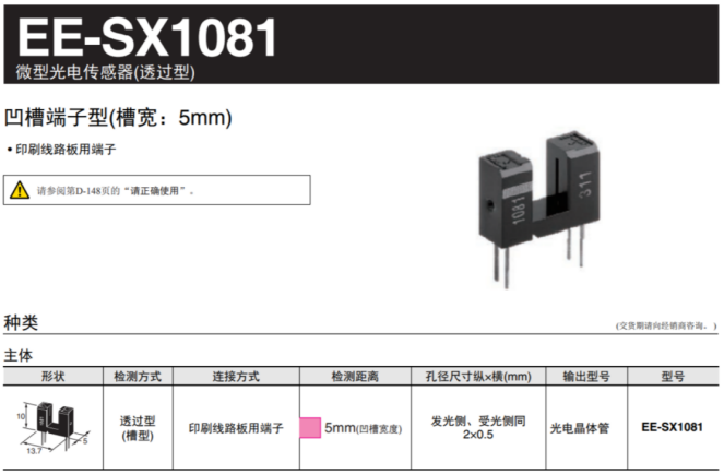 EE-SX1081 是一款透射式光電傳感器, PCB安裝。光電傳感器是一種緊湊型光學(xué)傳感器, 可通過光束感應(yīng)物體的位置。通用型號(hào)帶有5mm寬槽。高分辨率0.5mm寬孔徑, 光電晶體管傳感器輸出。透射式光電傳感器包含發(fā)射器和檢測(cè)器, 面對(duì)對(duì)方, 當(dāng)物體位于發(fā)射器和檢測(cè)器之間, 物體會(huì)攔截發(fā)射器的光束, 從而減少檢測(cè)器接受的光信號(hào)。-25至85°C 工作溫度范圍