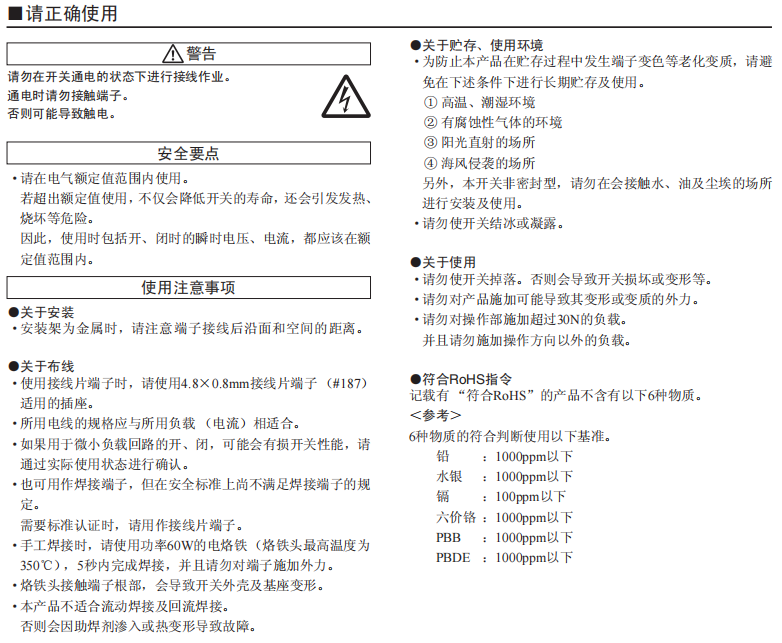 接點(diǎn)間隔3mm以上的小型電源開(kāi)關(guān) 采用特定的速斷機(jī)構(gòu),可進(jìn)行功率負(fù)載開(kāi)、閉。開(kāi)、閉利落、良好的操作感。 確保接點(diǎn)間隔3mm以上。 符合UL、cUL標(biāo)準(zhǔn)、符合EN標(biāo)準(zhǔn)。
