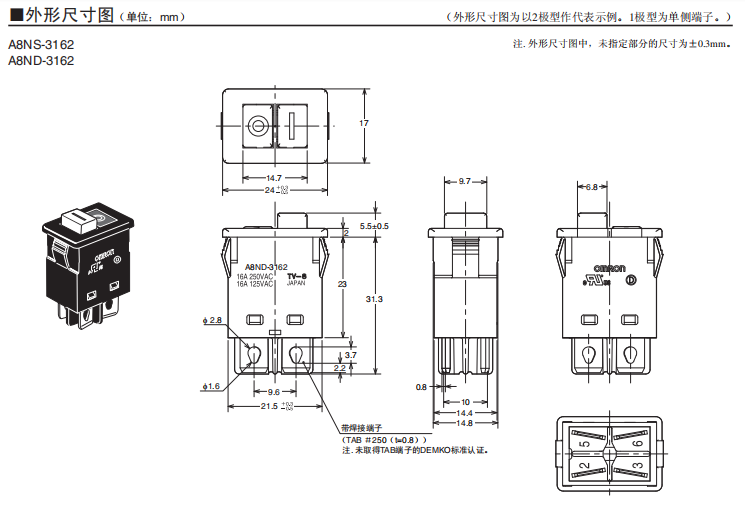 A8M 小型船型開關 實現(xiàn)16A開關性能的小型船形開關 小型、16A的開關性能。 可進行一觸式安裝。 符合UL、cUL認證,EN標準適用品。