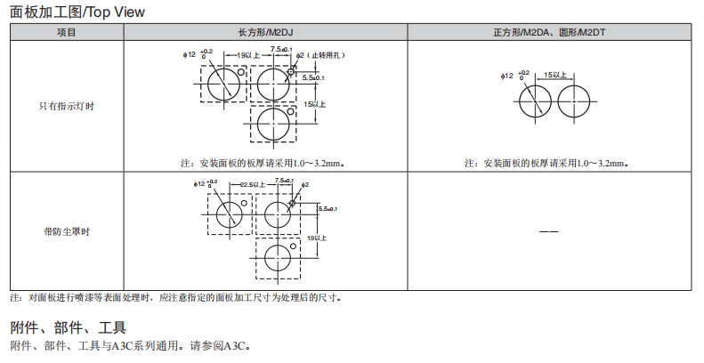 長20mm、 圓型f12系列 ●與按鈕開關(guān)A3C系列是同一類型。 ●高亮度的均一表面發(fā)光。 ●圓形便于開孔。