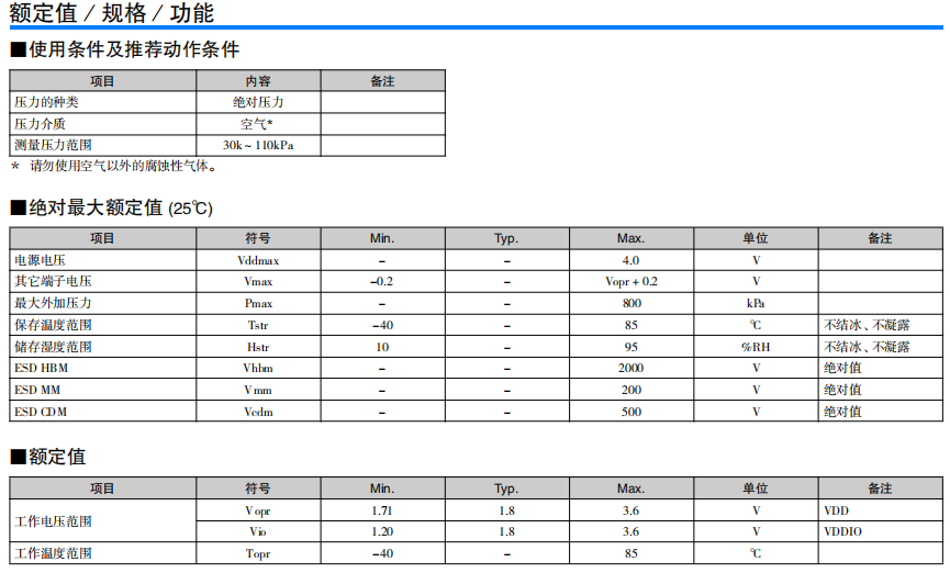高精度·低消耗電流的小型MEMS絕對(duì)壓力傳感器 高精度地測(cè)量氣壓 內(nèi)置低干擾的24bit ADC 基于I2C/SPI 接口的數(shù)字控制/輸出 在自動(dòng)睡眠模式下實(shí)現(xiàn)低消耗電流 單獨(dú)的補(bǔ)償系數(shù)保存在OTP*中 (* One Time Programmable - ROM)